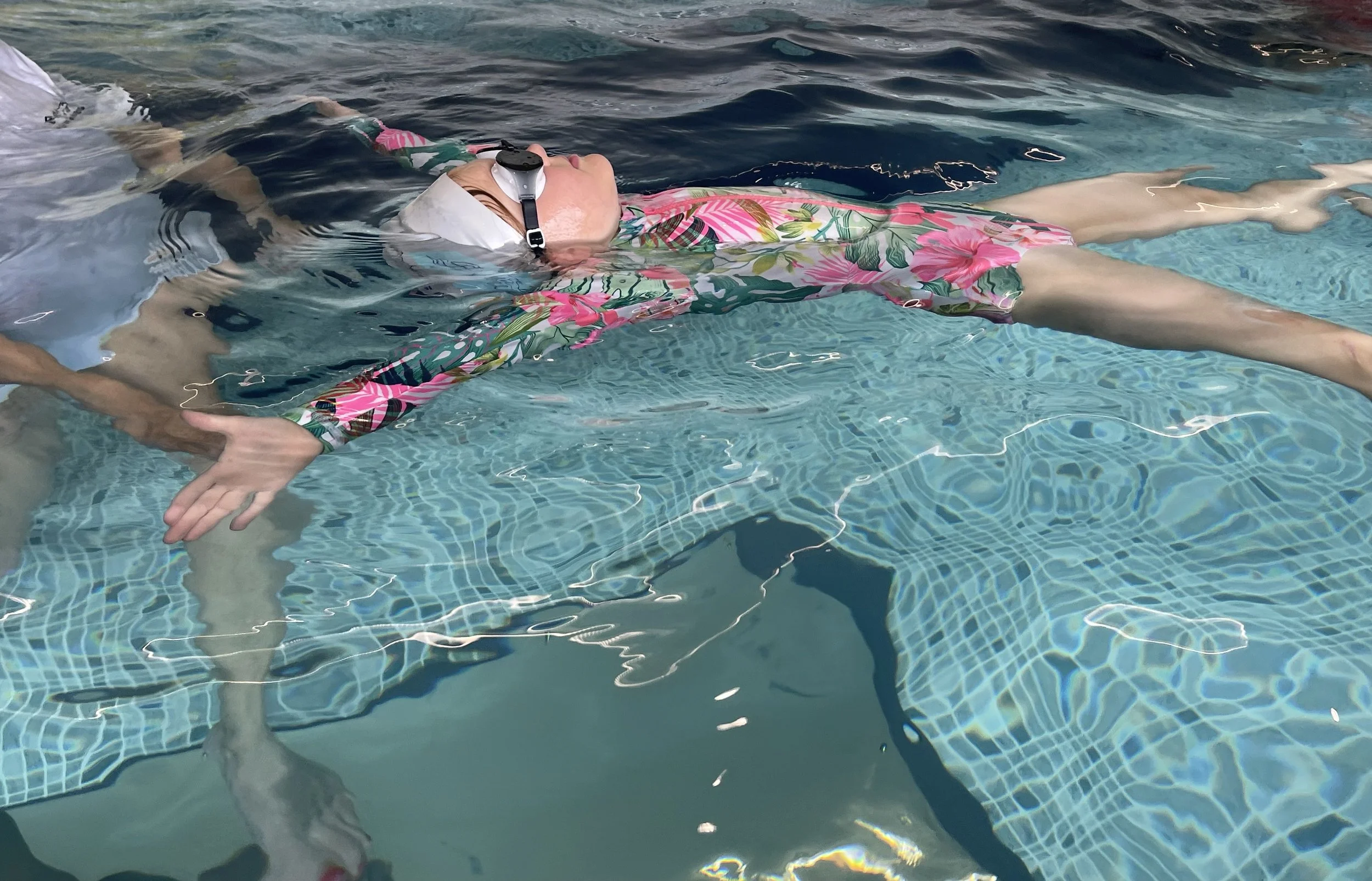 Person floating on their back in a swimming pool, wearing a floral rash guard, goggles, and a swimming cap.